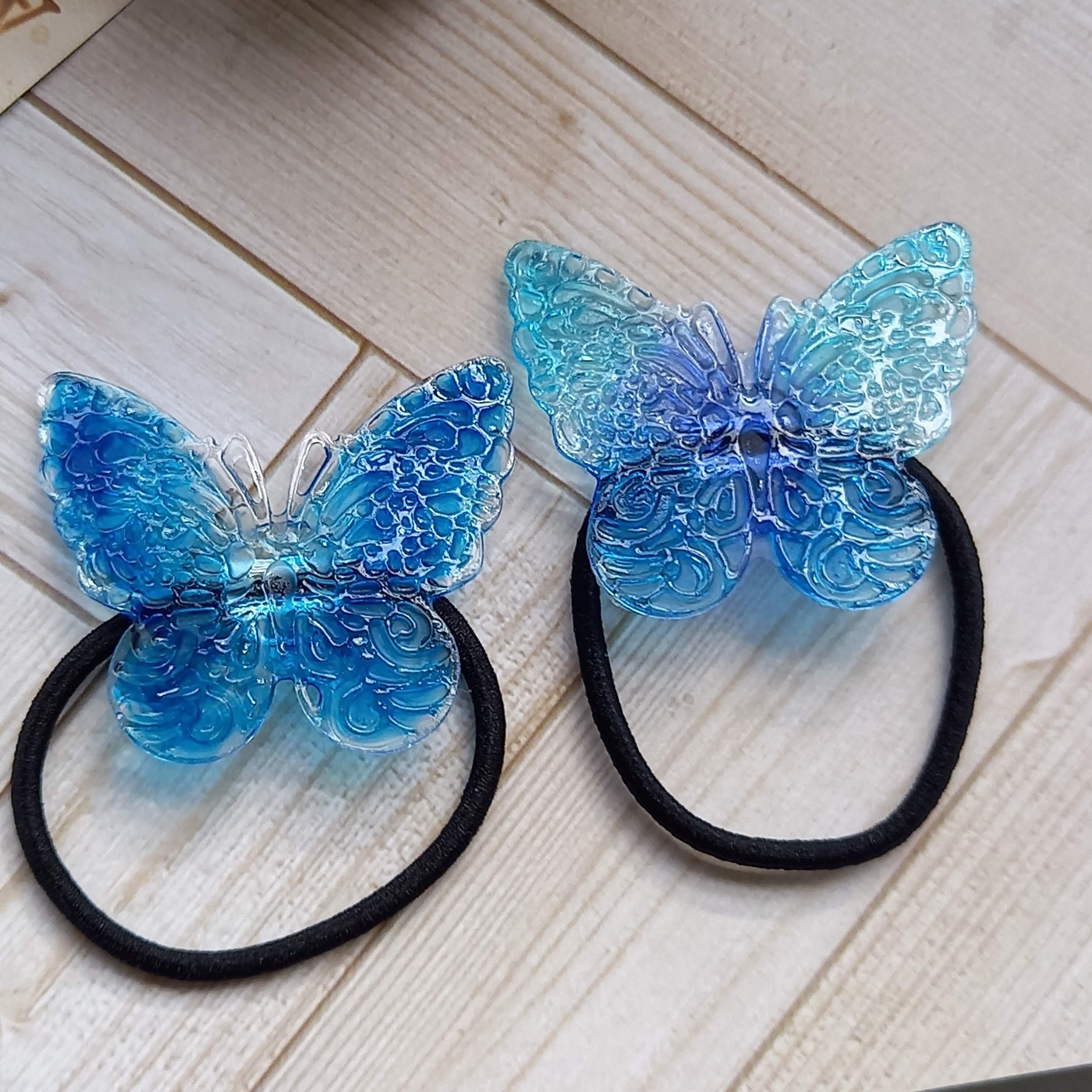 青い蝶を2種類ご用意しました。髪をまとめる以外にもペンをくるっと巻いてまとめたり、腕にはめておく、部屋のアクセントに…などなどご使用範囲は無限です。見て触って楽しんで頂けたら幸いです。