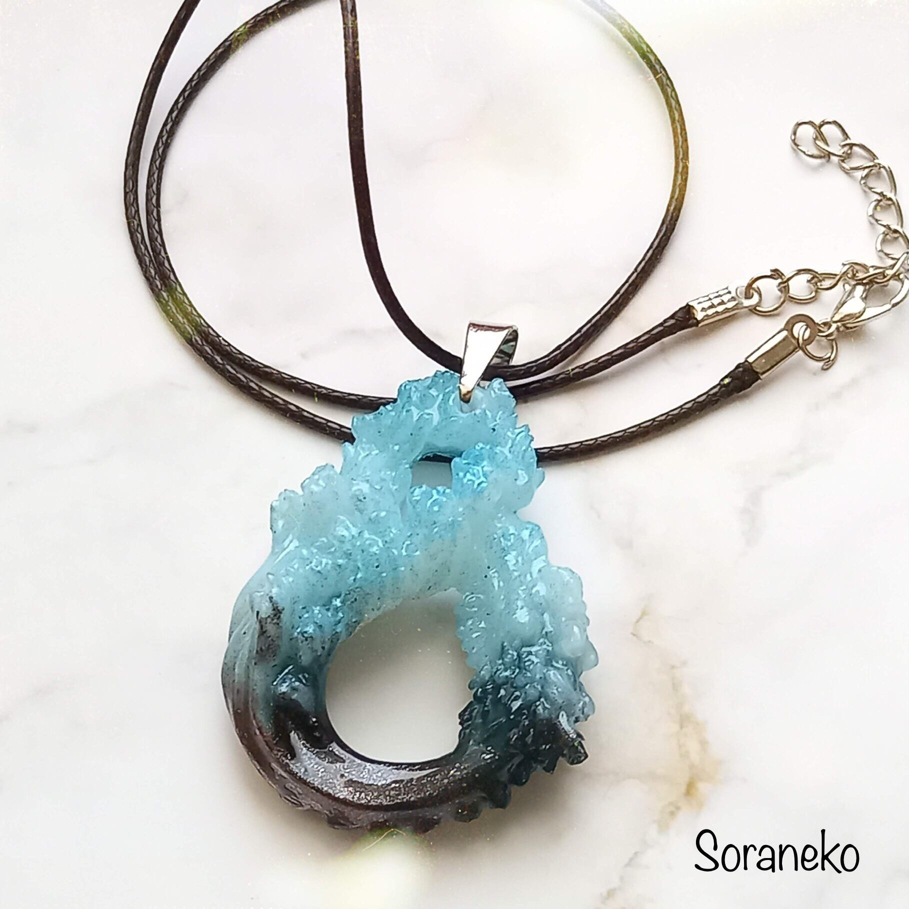 ネックレスは水色と黒のグラデーションに輝きをプラスしました。ガッチリしたデザインなのでフェイクレザーからスェード調の紐に変更可能です。ご希望の際はお知らせください。