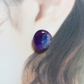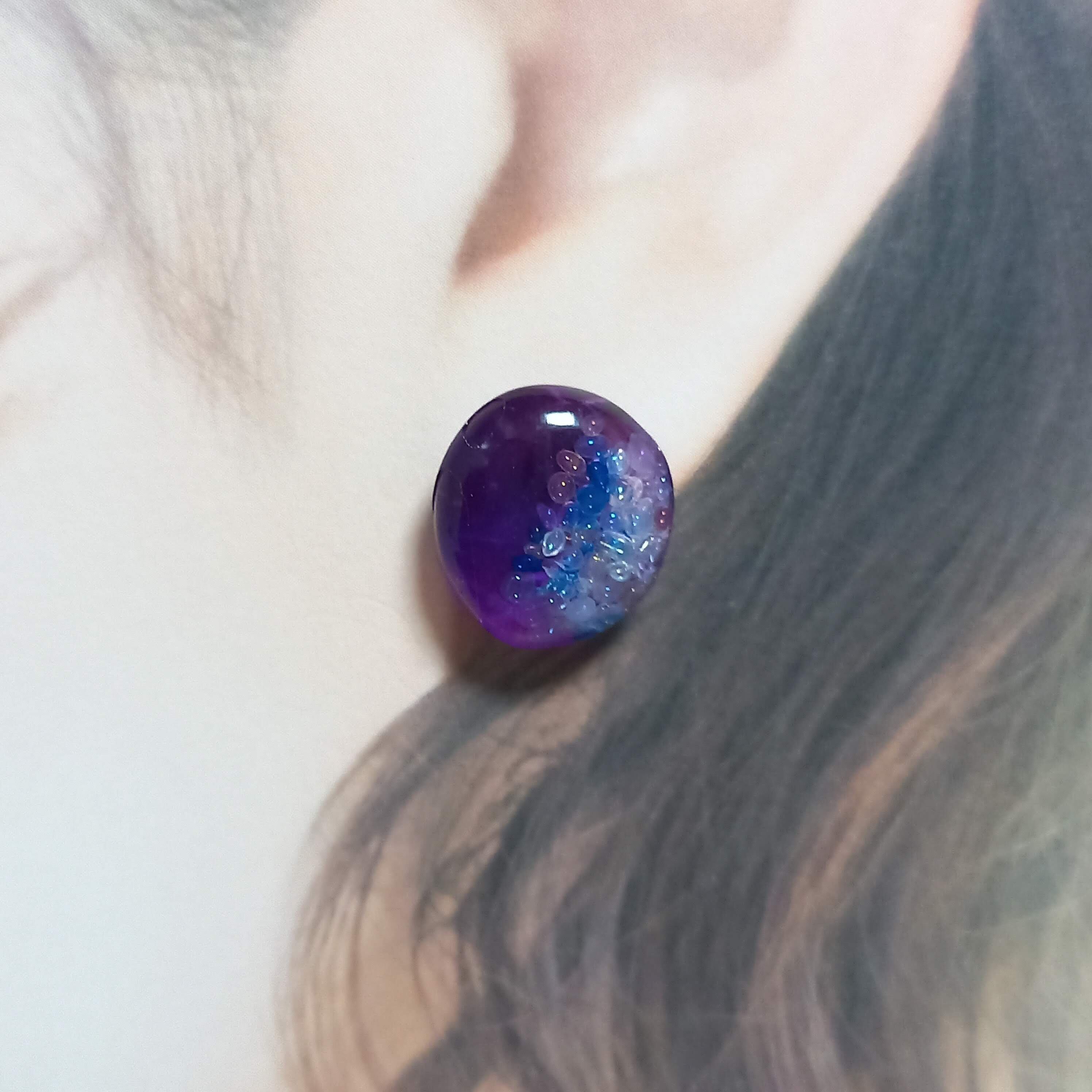 クリア、ブルー、パープルのガラス粒子を合わせ入れたシンプルでも飽きのこないデザインピアスに仕上げました。同じ配色のBIG版もございます。