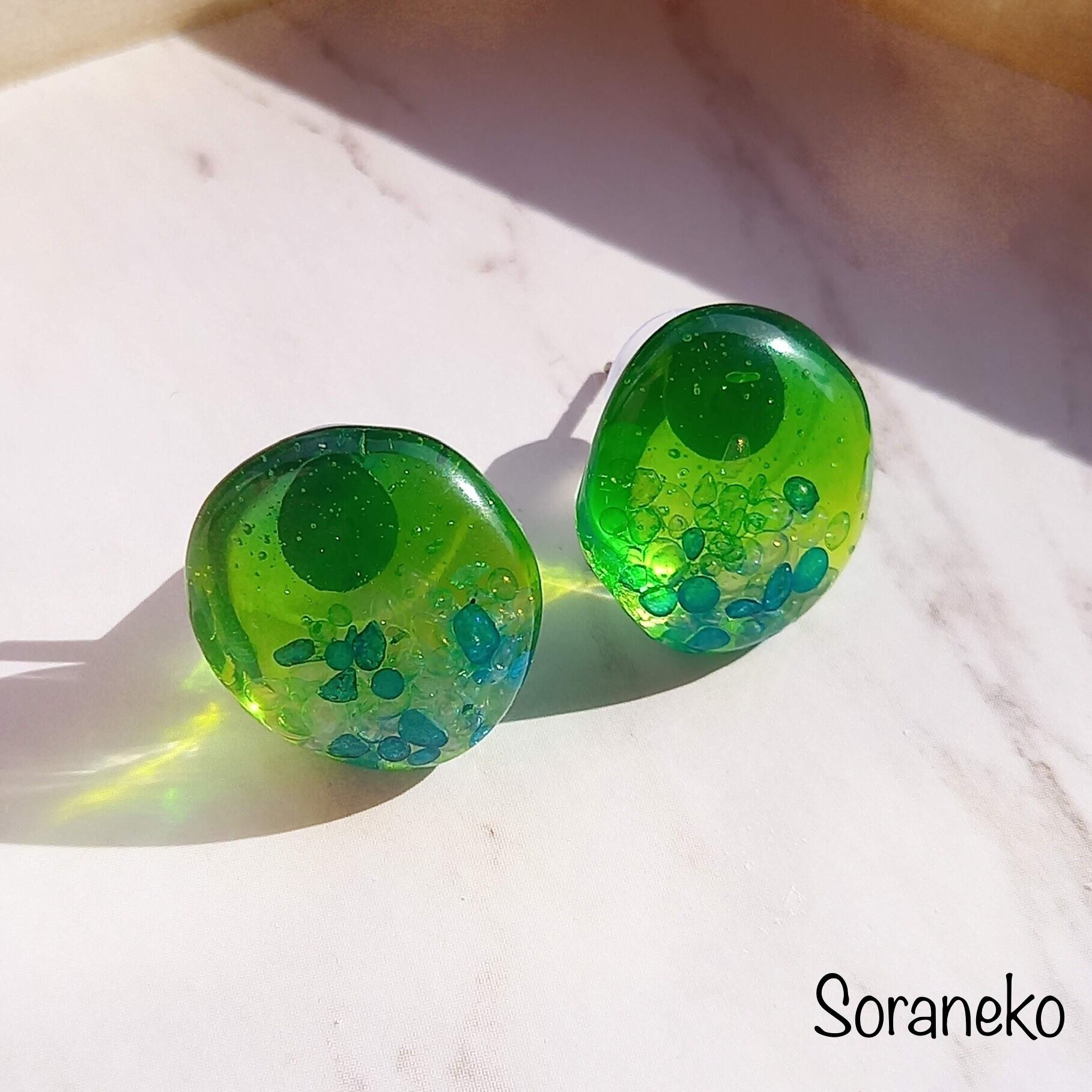クリア、ブルー、グリーンのガラス粒子を合わせ入れたシンプルでも飽きのこないデザインピアスに仕上げました。同じ配色のBIG版もございます。